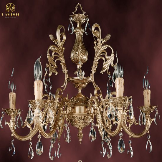• Chất liệu: Đồng mạ vàng kết hợp pha lê Asfour cùng chao đèn làm bằng lụa Organza của Italy.